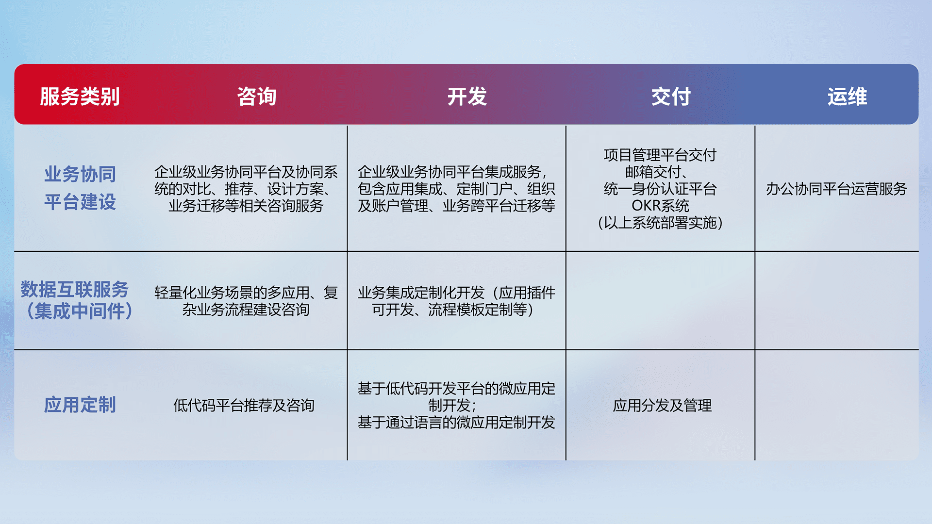针对钉钉、、、、企微、、IDaas等平台级产品提供产品的规划、、方案、、、交付、、、定制化开发等服务,,,实现如统一协同办公、、、智能客户服务、、混合会议管理、、、、智能数据查询、、、等业务场景,,,,实现数字化转型。。